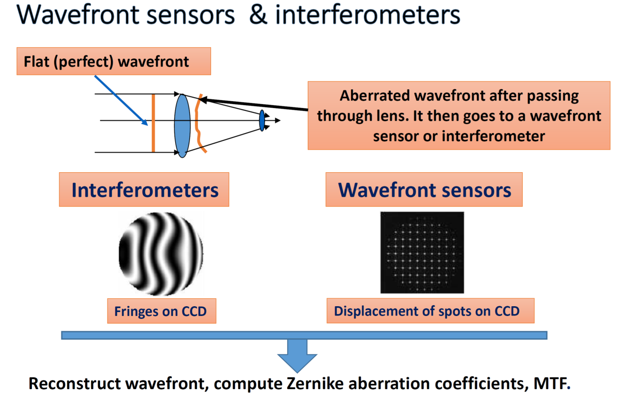 The flat-field (ideal) wavefront is distorted after passing through the optical lens/system. The distorted wavefront reaches the wavefront sensor or interferometer. The picture on the left shows the bar detected by the interferometer.