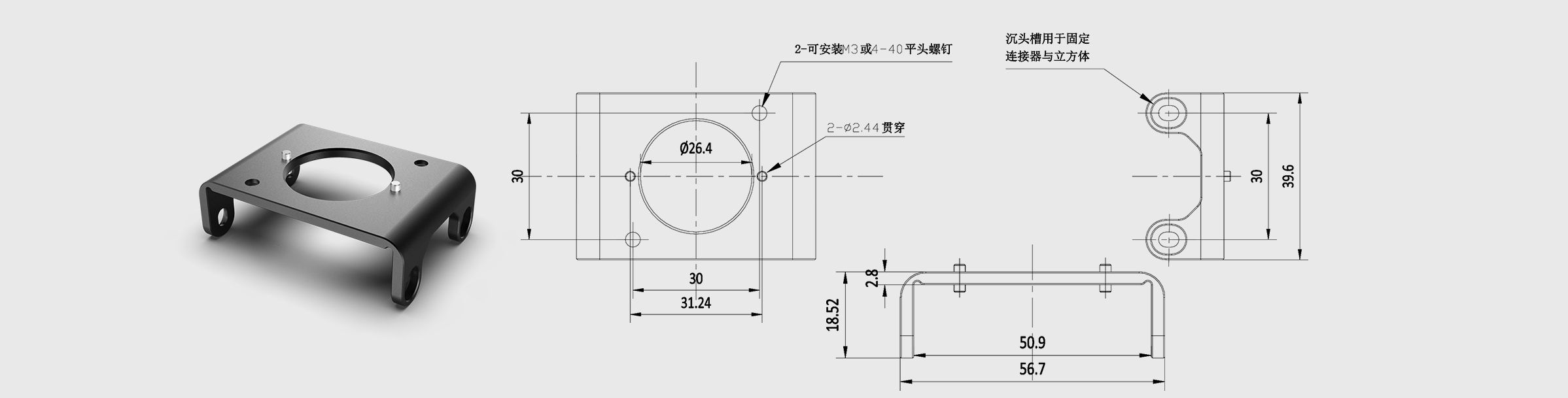 This cube Connector Compatible with 30mm Cage Cubes, the center of the 530044 is with φ 26.4mm through hole, designed for connecting two cage cubes. Two Φ2.37 mm*6.5 mm Alignment Pins ensure that the center of the round hole is aligned with the center of the SM1 threaded hole of the cage cube.