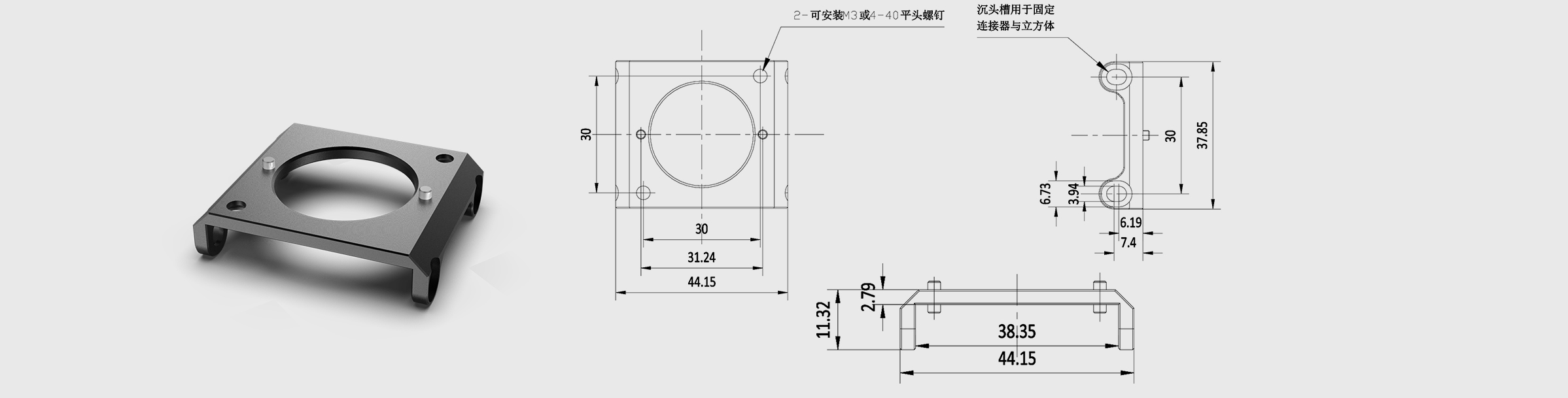This cube Connector Compatible with 30mm Cage Cubes, the center of the 530044 is with φ 26.4mm through hole, designed for connecting two cage cubes. Two Φ2.37 mm*6.5 mm Alignment Pins ensure that the center of the round hole is aligned with the center of the SM1 threaded hole of the cage cube.