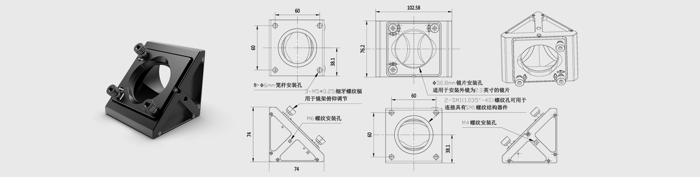 60 mm Cage Right-Angle Mirror Mount 6mm Tapped Hole M4/M6 Thread