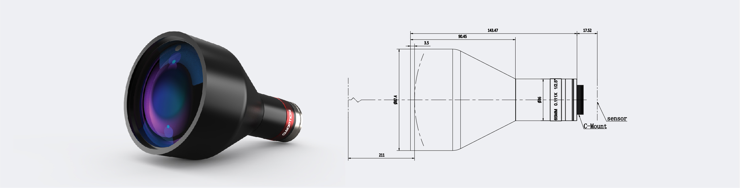 | 13 | Lens Size(Dia.×Length) | Ф87.4×143.5mm | |