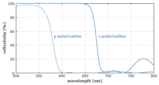 图2:由薄膜涂层粘接两个 45° 棱镜得到的偏振立方体。 由于多层涂层之间的干涉效应与偏振有关,因此薄膜偏振片只能工作在有限的波长和角度范围。通过优化薄膜设计,工作波长能够到达几百纳米的范围。但是,这种宽带偏振片不能达到窄带偏振片(激光线偏振片)的性能。图3给出了一个工作带宽为50nm的偏振片的反射率曲线。