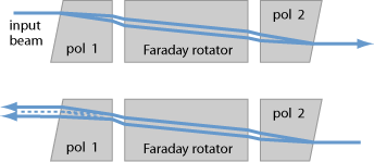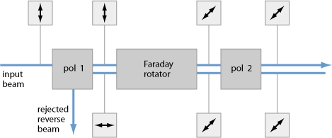 如果光经过反射后以相同的偏振态进入隔离器的出射端口,仍然可以无损耗的通过第二个偏振器。然后通过法拉第旋转器其偏振态又旋转了45°,因此光不能通过第一个偏振器,或者说光会进入另一个单独的出射端口。