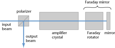 - 45°旋转器与端反射镜结合就组成了法拉第旋镜。如果激光光束进入放大器中(图1),然后被法拉第旋镜反射重新进入放大器中,这时反射光束的偏振方向与入射光束是正交的,尽管放大器不能保持偏振状态。因此,只需一个偏振器就可以分离开这两束相向传播的光束。这比采用法拉第隔离器,放大器加上常规反射镜要好。