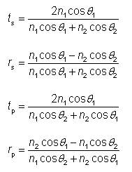 其中n1 和n2 是两介质的折射率。对应的传播角度(与法线的夹角)为 θ1 和 θ2(见图1)。例如,s偏振(电场矢量与入射平面垂直)透射系数大小为ts。