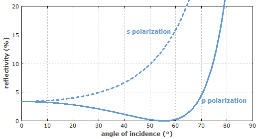 图2给出了界面处功率反射率与入射角度和偏振态的关系。P偏振在入射角为布儒斯特角时(这里约为55.4°)反射系数变为0.